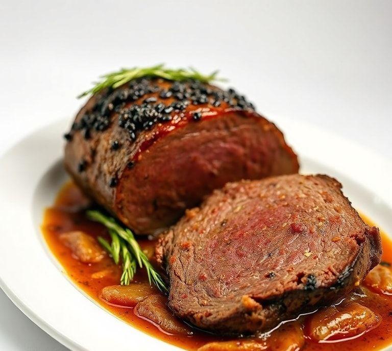 You can use beef broth, game stock, or a combination of broth and red wine as the cooking liquid. Adding onions, garlic, and herbs to the liquid enhances the flavor. The liquid should cover at least one-third of the roast to prevent it from drying out.